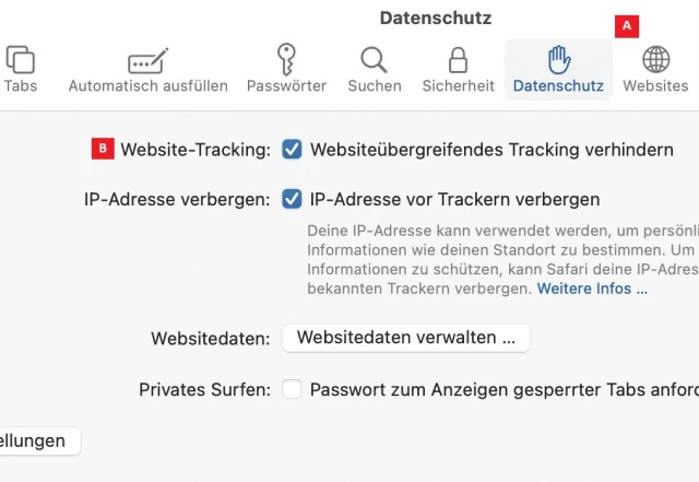Auch ohne iCloud+ kann Safari die Nachverfolgung deutlich erschweren. Öffnen Sie in den Einstellungen von Safari den Bereich Datenschutz, Bild 2 A. Markieren Sie die Option Websiteübergreifendes Tracking verhindern B. Damit bleiben die Tracker erfolglos, weil Safari Tracking-Cookies und Skripte von Drittanbietern blockiert, die für eine Analyse des Surfverhaltens nötig sind. So wird auch verhindert, dass eingebettete Inhalte wie Social-Media-Buttons einen Benutzer identifizieren und später wiedererkennen.