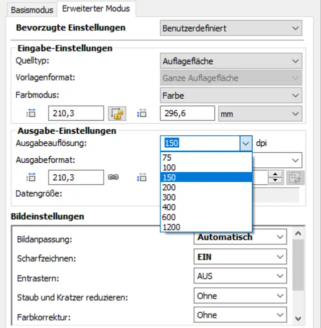 Bild 10: Die Auflösung lässt sich in der Software regeln. Für Texte reichen 150 dpi völlig aus