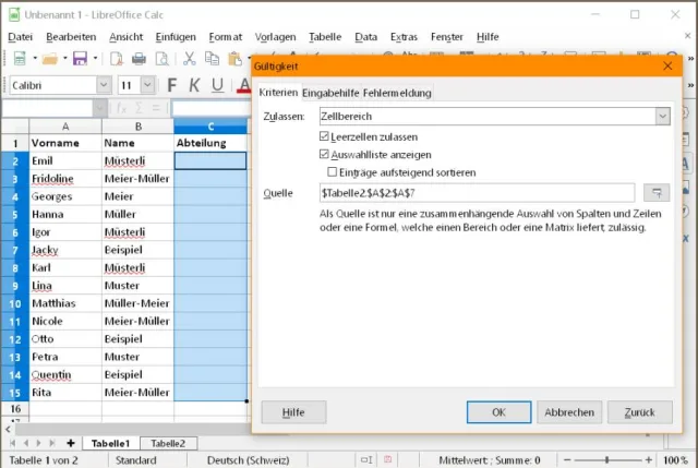 Sie haben zum Beispiel im ersten Tabellenblatt eine Mitarbeiterliste, die Sie jetzt mit einer Abteilung ergänzen wollen. Dabei wollen Sie die Abteilung jeweils aus einem Drop-down-Menü auswählen, damit Sie diese nicht immer eintippen müssen. Ausserdem sollen nur Einträge erlaubt sein, die in der vordefinierten Liste mit Abteilungen vorkommen.