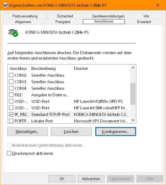 Lösung: Öffnen Sie die Systemsteuerung und gehen Sie darin zu Geräte und Drucker. Klicken Sie mit rechter Maustaste auf den betroffenen Drucker und öffnen Sie die Druckereigenschaften. Wechseln Sie zum Reiter Anschlüsse. Wenn es ein klassisch verbundener Netzwerkdrucker ist, gibts in der Liste der Einträge einen IP-Eintrag, der angehakt ist.