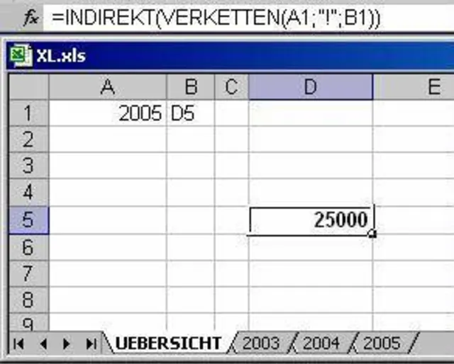 Ich habe in Excel Tabellenblätten mit «2002», «2003» und «2004» benannt (alle identisch aufgebaut). Jetzt möchte ich aus einem Übersichtstabellenblatt aus einem dieser Blätter die Zelle D5 referenzieren, wobei ich im Übersichtsblatt in der Zelle A1 den Namen der Quell-Tabelle eingebe. Wenn also zum Beispiel A1 «2003» enthält dann soll der Wert der Zelle D5 in der Tabelle 2003 zurückgeliefert werden. Ich möchte also einen dynamischen Zellbezug verwenden.