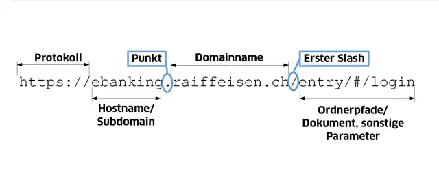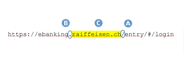 Alles zwischen dem ersten Slash (A) und von dort aus (nach links fahrend) dem zweiten Punkt (B) ist die Domain, zu der dieser Link führt. In diesem Beispiel ist es seriös (raiffeisen.ch)