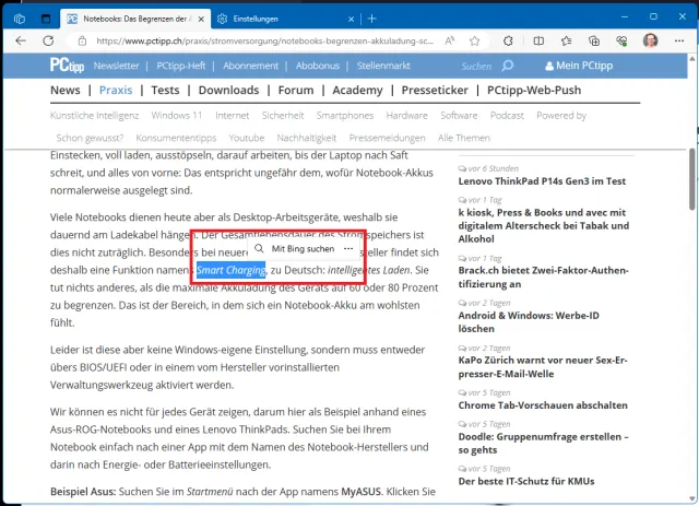 Quelle: PCtipp.chHinweis: Wenn Text markiert ist, steht Ihnen über die rechte Maustaste weiterhin das Kontextmenü zur Verfügung, in welchem Sie unter anderem Befehle wie Kopieren oder Im Web nach (Suchbegriff) suchen finden. Letzteres sucht nicht zwingend mit Microsofts eigener Suchmaschine Bing, sondern mit jener, die Sie unter Einstellungen/Datenschutz, Suche und Dienste/Adressleiste und Suche als Standardsuchmaschine festgelegt haben.