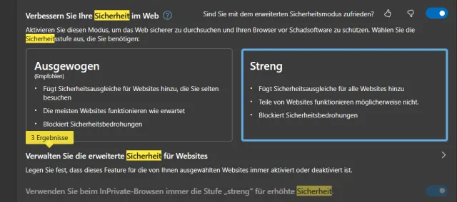 - Falls Sie üblicherweise einen strengen Sicherheitsmodus wünschen, ändern Sie die Stufe hier entsprechend. Microsoft empfiehlt jedoch die ausgewogene Variante. Auch diese blockiert Sicherheitsbedrohungen. Während bei der strengen Version Teile von Webseiten möglicherweise nicht funktionieren, sollten bei der Stufe Ausgewogen die meisten Webseiten normal funktionieren.