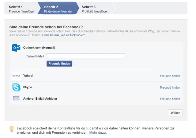Nun will Facebook noch gerne Zugriff auf Postfächer, Skype oder weitere E-Mail-Konten, um nach Ihren bekannten Kontakten zu suchen, die auch auf Facebook sein könnten. Das lehnen wir alles dankend ab. Klicken Sie einfach auf Weiter bzw. überspringen Sie diesen Schritt.