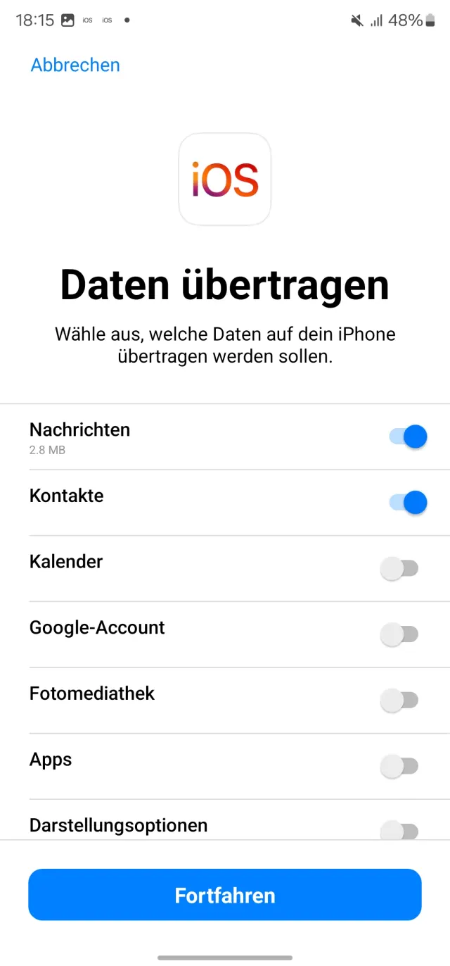 Wenn Sie alle Daten ausgewählt haben, klicken Sie auf die Schaltfläche Fortsetzen. Anschliessend beginnt die Übertragung.