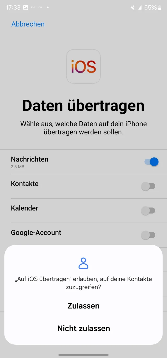 Achtung: Es kann sein, dass Sie aufgefordert werden, der App Auf iOS übertragen gewisse Zugriffsrechte zu gewähren. Klicken Sie unbedingt auf Zulassen, ansonsten funktioniert die Übertragung nicht, Bild 9. Der Grund ist simpel: Wenn Sie zum Beispiel Kontakte übertragen möchten, die App aber nicht auf Ihr Telefonbuch zugreifen darf, kann sie die Daten von dort nicht abrufen.