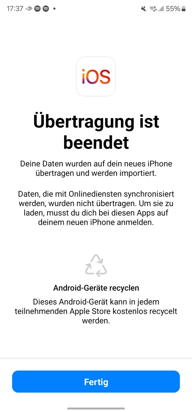 Wichtig: Auch wenn Ihr Android-Handy bereits anzeigt, dass die Übertragung erfolgreich war, lassen Sie beide Geräte am Strom und verwenden Sie diese noch nicht. Erst, wenn Ihr iPhone angibt, dass die Übertragung beendet ist und der Transferbalken bei 100 Prozent steht, ist der Umstieg tatsächlich abgeschlossen. Ihr iPhone wechselt danach automatisch zum Bildschirm Übertragung ist beendet, Bild 11. Klicken Sie auf dem Android-Gerät auf Fertig. Auf Ihrem iPhone können Sie jetzt auf Fortfahren klicken, um die Einrichtung abzuschliessen. Unter anderem werden Sie aufgefordert, sich mit einer Apple-ID anzumelden. Falls Sie noch keine haben, erstellen Sie eine. Tun Sie das nicht, kann das iPhone die Apps, die Sie transferieren wollen, nicht aus dem App Store herunterladen.