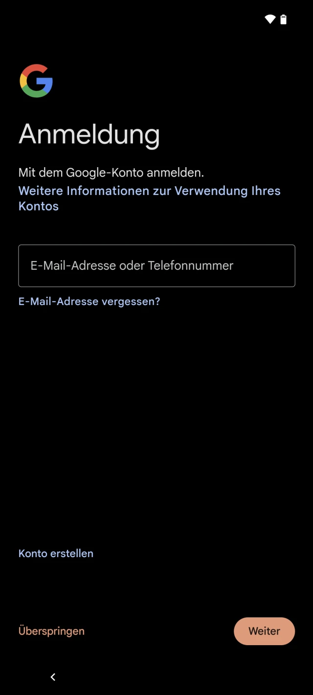 Nun kommen Sie zum Bildschirm für die Anmeldung mit Ihrem Google-Konto. Dieses ist das Pendant zur Apple-ID und Ihr Zugang zur Android-Welt. Zwar könnten Sie die Anmeldung überspringen, aber dann lassen sich keine Apps aus dem Google Play Store herunterladen und installieren, Bild 16.