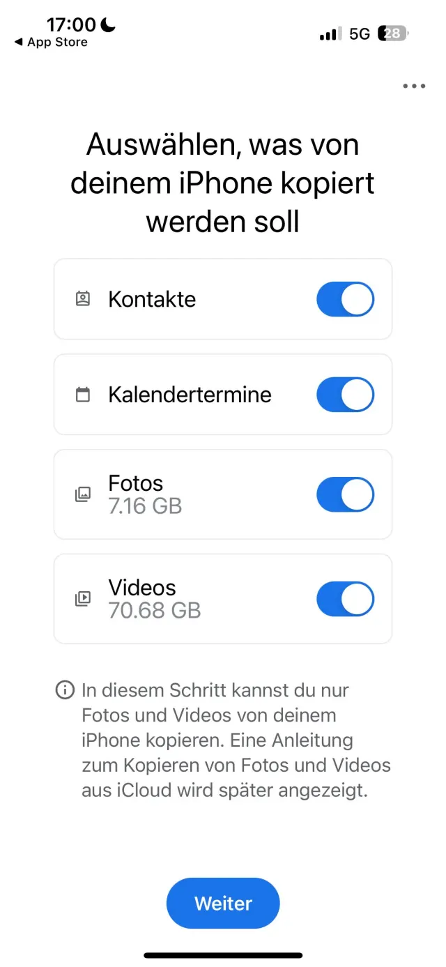 Übertragen können Sie Fotos, Videos, Kontakte und Kalendereinträge. Apps lassen sich leider nicht transferieren, da iOS-Installationsdateien nicht mit Android kompatibel sind. Sie müssen also notgedrungen die Apps im Google Play Store suchen und herunterladen. Das Positive: Es ist eine vielversprechende Möglichkeit, die Apps auszusieben, die Sie ohnehin nie benutzen.