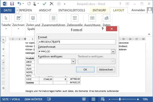 Quelle: PCtipp.chWord schlägt manchmal auf Anhieb die Funktion «=SUM(ABOVE)» vor, was bedeutet, dass die Zahlen aller darüber stehenden Zellen addiert werden. Falls Sie lieber etwas anderes berechnen wollen oder kein Vorschlag erscheint, löschen Sie die Formel, tippen ein Gleichzeichen ein und gehen unten zu Funktion einfügen. Hier gibts dann auch z.B. die Multiplikation «=PRODUCT()». Soll Word die links davon stehenden Zahlen berechnen, tippen Sie anstelle von «(ABOVE)» einfach «(LEFT)» ein.