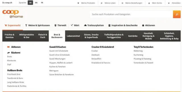 Quelle: Screenshot/cm/PCtippGanz oben rechts im Browser sind Informationen zum Kundencenter (Meine Produkte, Meine Listen, Meine Bestellungen und Mein Konto) zu sehen. Etwas weiter unten, über die Seite verteilt, finden sich von links nach rechts Tabs mit Supermarkt und Kategorien wie Weine und Spirituosen, Tierwelt, Märt (heimische Produkte, Region wählbar), Traiteurplatten etc. Unterhalb davon sehen Sie Einkaufskategorien wie Früchte und Gemüse, Milchprodukte und Eier, Fleisch und Fisch, Brot und Backwaren etc. Wer auf einen der Tabs klickt, erhält ein Untermenü (siehe Bild). Beispielsweise bei Brot und Backwaren werden alphabetisch erst die Aktionen, dann Bäckerei, haltbare Brote, Guezli und Kuchen und mehr aufgelistet.
