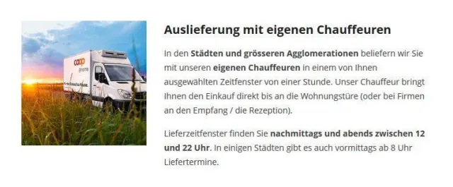 Was Coop bietet, ist die Lieferung mit dem Paketdienst. Der Pöstler liefert von Dienstag bis Freitag (Samstag je nach Gemeinde). Die Lieferzeit reicht von 9 bis 20 Uhr. Lebensmittel und Tiefkühlprodukte, die gekühlt werden müssen, sind kein Problem, da sie mit isolierten Transportboxen und Trockeneis geliefert werden. Mehr über den Paketdienst finden Sie hier.