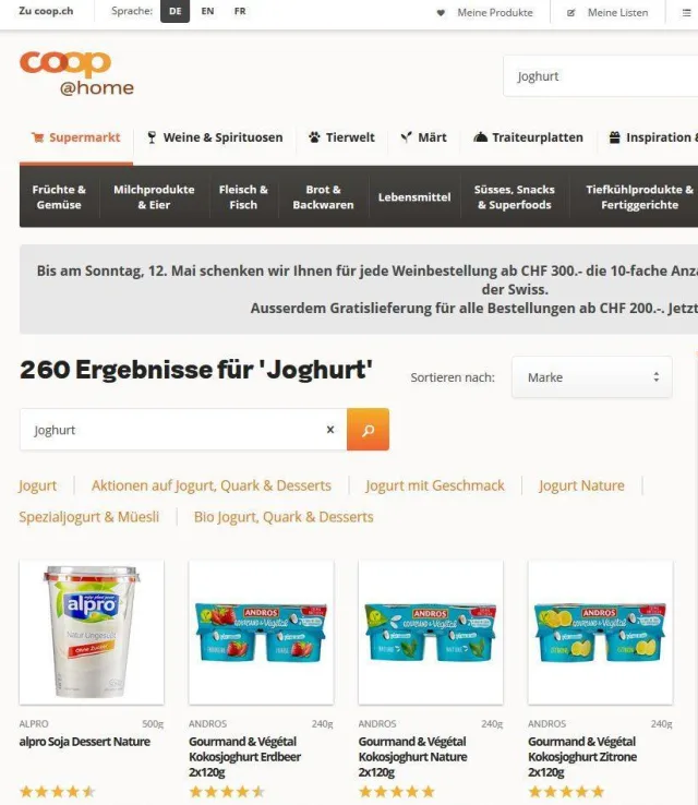Wenn Sie nach einem Produkt (zum Beispiel Joghurt) oder Hersteller suchen, sehen Sie mittig die Suchresultate. Oberhalb finden Sie Filterbegriffe wie beispielsweise Joghurt Nature oder Spezialjoghurt und Müesli. Wie bei Coop üblich, findet sich oberhalb ein Drop-down-Menü (Sortieren nach). Hier können Sie die Resultate nach Relevanz, Beliebteste, Name, Marke, Preis, Aktionen und Bio sortieren.