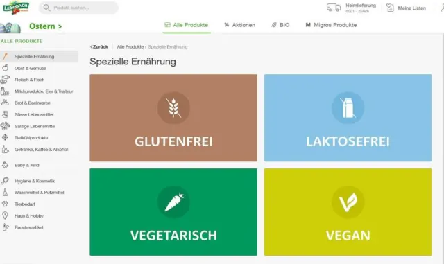Sind Sie Veganer, Vegetarierin oder suchen glutenfreie Produkte? Dies finden Sie hier sehr schnell. In der linken Spalte aufgeführt ist die Spezielle Ernährung. Wir waren überrascht: Obwohl wir das Sortiment in einem Bereich davon recht gut kennen, gab es neue Lebensmittel zu entdecken.