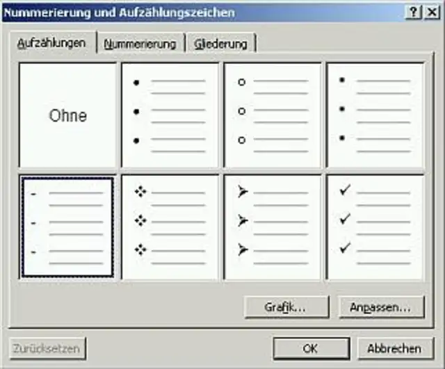 Wählen Sie die Aufzählungsart mit dem Bindestrich und klicken Sie rechts unten auf den Knopf "Anpassen".