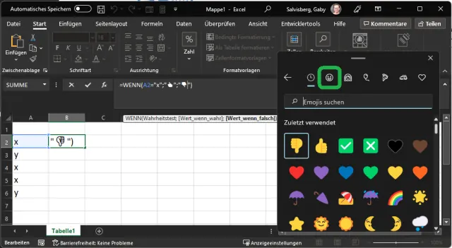 Lösung: Geben Sie wie gewohnt Ihre Formel ein. Für die Eingabe des Emojis können Sie nun direkt im Formelfeld mit Windowstaste+Punkt das Emoji-Fenster aufrufen. Wechseln Sie zum Emoji-Reiter und wählen Sie das gewünschte Symbol aus. So lautet Ihre Formel damit beispielsweise wie folgt und bedeutet: Wenn A2 ein x enthält, dann Daumen hoch, ansonsten Daumen runter.