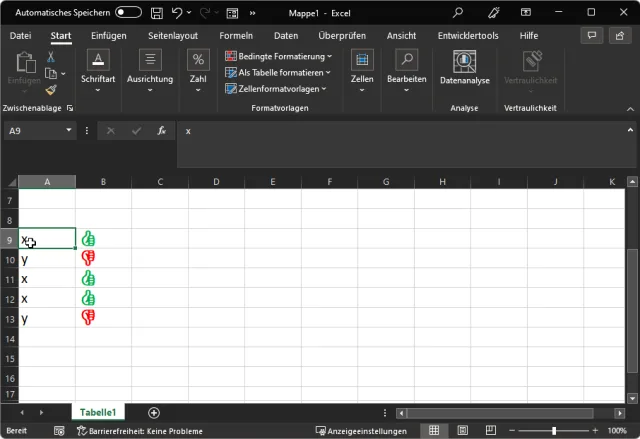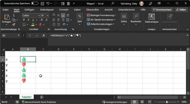 =WENN(A2="x";"👍";"👎")