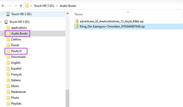 In diese zwei Ordner kopieren Sie die EPUB-Dateien bzw. ein ZIP-File Ihres Hörbuchs (im Beispiel: PocketBook Touch HD 3)