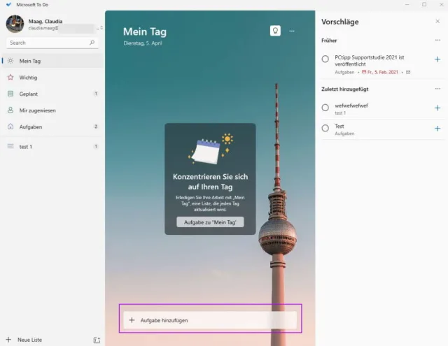 - Hier finden Sie das Gewünschte in der Mitte unter Aufgaben bzw. Aufgabe hinzufügen. Tippen Sie beispielsweise morgen oder 10. April ein. Laut Microsoft erkennt To Do dann das Fälligkeitsdatum automatisch, wenn Sie die Aufgabe speichern. Auch hier funktionierte die automatische Datumserkennung noch nicht. Wählen Sie das Fälligkeitsdatum manuell aus und klicken Sie auf Hinzufügen.