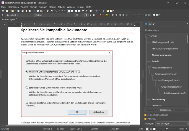 Ein grosser Pluspunkt des Programms Textmaker ist seine Kompatibilität zu anderen Textverarbeitungen. So lassen sich auch Dokumente aus älteren Versionen von Microsoft Word problemlos und verlustfrei öffnen. Beim Speichern von Dokumenten können Sie zwischen den Dateiformaten von Microsoft Office oder den eigenen Free-Office-Formaten wählen, Bild 4. Ausserdem lassen sich Dateien im Format PDF exportieren.