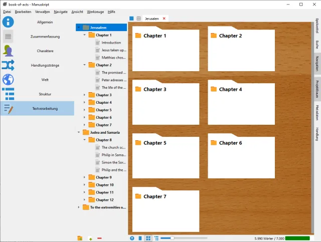Bild 5: Der Modus Fiktionaler Text in Manuskript zeigt ungewöhnliche Elemente wie Charaktere und Handlungsstränge