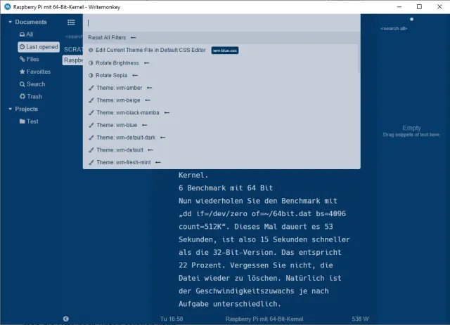 Beim Schreiben bleibt die aktuelle Zeile stets in der Mitte des Bildschirms, anstatt nach unten zu rutschen. Zu den Menüpunkten gelangt man nach einem Klick mit der rechten Maustaste auf den Textbereich, Bild 8. Mit Toggle full screen gelangen Sie zur ablenkungsfreien Vollbildansicht. Command Palette führt Sie zu weiteren Befehlen. Die Denkaufgabe besteht darin, zu erkennen, dass man die Liste nach unten scrollen kann. Dort findet man auch die Themes, um das Farbschema zu ändern. Die zuletzt verwendeten Befehle wandern nach oben. Wenn Sie Ihren Text fertig haben, können Sie ihn lediglich als TXT-Datei abspeichern oder ausdrucken. Writemonkey benötigt keine Installation und ist ein äusserst schlankes Tool.