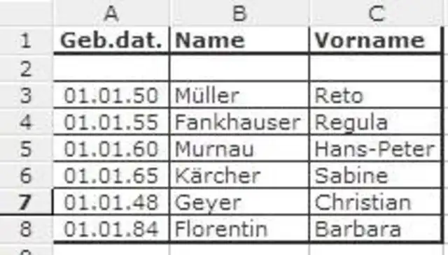 In der ersten Spalte steht das Geburtsdatum, in der zweiten Spalte steht der Name. Die Tabelle kann selbstverständlich noch beliebig viele weitere Spalten enthalten, wie Postleitzahl und Ort etc. Wichtig ist nur, dass in der ersten Spalte das Geburtsdatum steht.