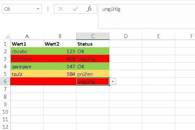 Auf genau diesem Weg verpassen Sie hier noch eine dritte Regel: Neue Regel/Formel zur Ermittlung der zu formatierenden Zellen verwenden, ein Klick ins Formelfeld und ins erste Statusfeld, diesmal ergänzen Sie die Formel mit dem Eintrag für Rot: =$C2="ungültig". Formatieren Sie auch diese Variante passend, eben zum Beispiel in Rot. Klicken Sie auf OK. Das sieht nun etwa so aus.