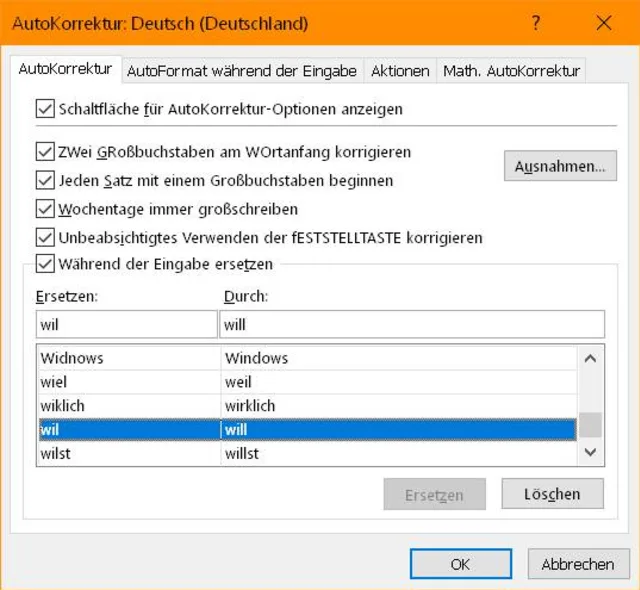 Variante 1: Löschen den Eintrag «Wil ersetzen durch will», wenn Sie nur gerade mit dieser einen Ersetzung häufig Probleme haben. Öffnen Sie hierzu Datei/Optionen/Dokumentprüfung und klicken Sie auf AutoKorrektur-Optionen. In der Liste unten scrollen Sie zum unerwünschten Eintrag, klicken ihn an und Löschen ihn. Wenn Sie den Eintrag in Excel löschen, ist er an in Word weg – und umgekehrt.