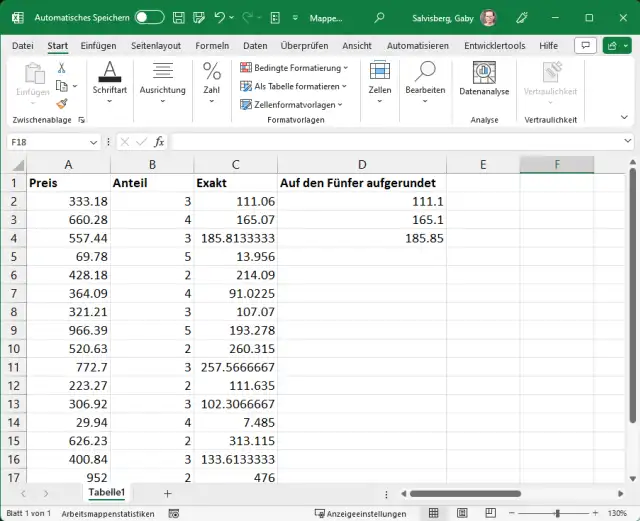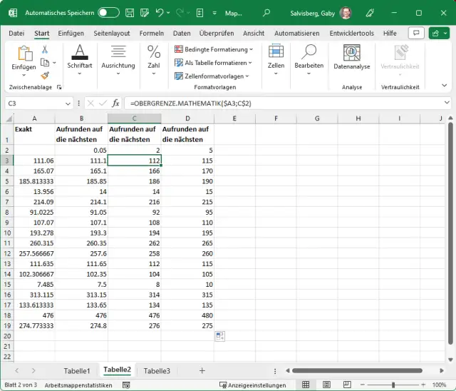 Excel bietet jedoch auch eine Funktion namens OBERGRENZE.MATHEMATIK. Sie wird verwendet, um eine Zahl auf die nächste ganze Zahl oder auf das nächste Vielfache eines bestimmten Schritts zu runden.
