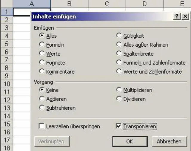 Mit einem Klick auf das enstsprechende Symbol in der Excel-Symbolleiste öffnen Sie nun eine neue Datei. Klicken Sie dort die Zelle A1 an und wählen Sie dann im Menü "Bearbeiten" den Punkt "Inhalte Einfügen". Klicken Sie im erscheinenden Dialogfenster die Option "Transponieren" an