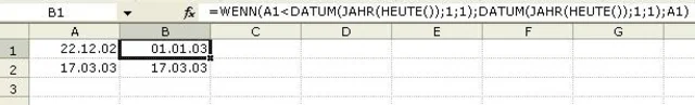 =WENN(A1<DATUM(JAHR(HEUTE());1;1);DATUM(JAHR(HEUTE());1;1);A1)