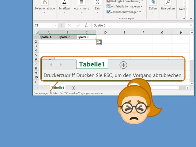 Entweder kommt Excel nach einigen Sekunden von selbst wieder zur Besinnung, manchmal legt es dazwischen noch ein «Keine Rückmeldung» ein und steht danach für weitere Eingaben bereit. Alternativ tut man wie geheissen: nämlich die Esc-Taste drücken, bevor es sich mit «Keine Rückmeldung» zu verabschieden scheint. Damit wird der ominöse Druckerzugriff abgebrochen und die Zellen werden wie beabsichtigt kursiv oder fett formatiert.