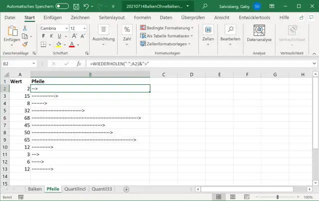 Lösung: Angenommen, Ihr Wert steht in A2, Ihr Balken oder Pfeil soll in B2 landen. Tippen Sie in B2 folgende Formel ein: =WIEDERHOLEN("u";A2). Das bedeutet, dass der Buchstabe «u» entsprechend dem Wert in A2 wiederholt wird. Nun hat der Buchstabe natürlich keine Ähnlichkeit mit einem Pfeil.