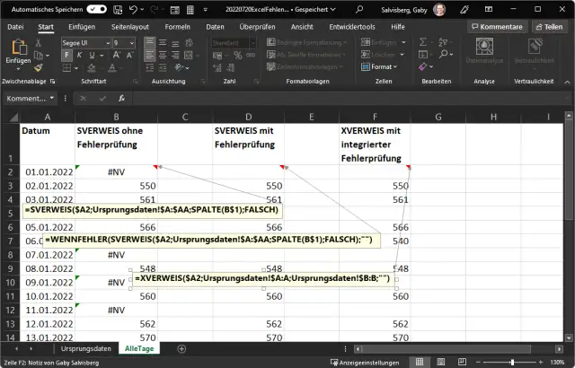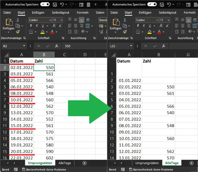 Lösung: Sie können zu SVERWEIS oder XVERWEIS greifen. Angenommen, im ersten Blatt namens «Ursprungsdaten» stehen in Spalte A die Kalenderdaten und in Spalte B die zugehörigen Werte. Wie Sie sehen, beginnen unsere Beispieldaten hier nicht mit dem 1.1.2022. Ausserdem fehlen Einträge, beispielsweise am 4., 7. oder 9. Januar und weiteren Kalenderdaten.