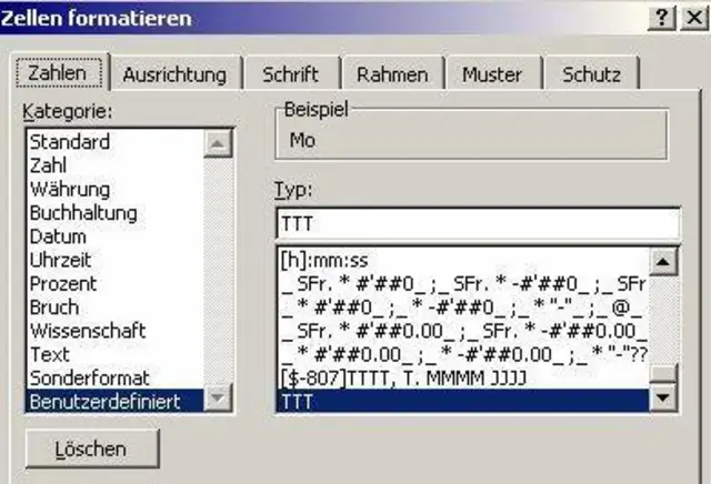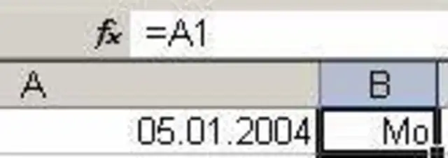 Die Anzeige des Wochentages erreichen Sie nun ganz einfach durch die Anzeige des Datums in der Nebenzelle, welches jedoch hier benutzerdefiniert formatiert ist.