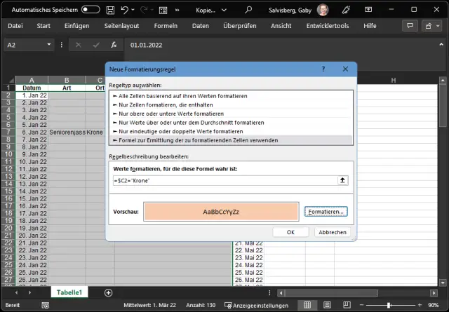 Wie Sie vielleicht schon vermuten, lösen Sie dies mit einer bedingten Formatierung. Aber wie erreicht man es, dass die ganze Zeile rot oder blau wird, wenn in einer einzelnen Zelle dieser oder jener Austragungsort (Restaurantnamen «Krone» oder «Bären») steht?