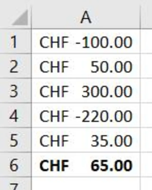 Die einfachste Form der Buchhaltung ist die Milchbüechlirechnung, auch Einnahmen-Ausgaben-Rechnung genannt. Dabei handelt es sich um eine einfache Auflistung von Transaktionen, die am Ende zusammengerechnet werden. Sie kaufen Lebensmittel für 100 Franken: 100 in die Ausgabenspalte. Sie verkaufen Ihre alten Schlittschuhe für 50 Franken: 50 in die Einnahmen. Am Ende wird alles zusammengerechnet und Sie sehen, ob Sie in der gewählten Zeitspanne Gewinn oder Verlust gemacht haben. Die entsprechende Formel in Excel lautet =SUMME(Bereich), wobei Sie den Bereich mit der Maus markieren oder per Tastatur eintragen können.