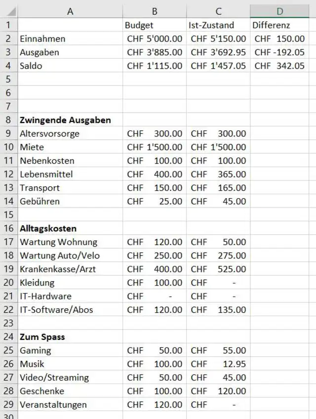 Sie notieren also alle erwarteten Ausgaben und Einnahmen für die kommende Zeitspanne, meistens pro Monat. Dabei sollten Sie logischerweise nicht mehr budgetieren, als Sie ausgeben können. Ob alles verfügbare Geld budgetiert werden muss, darüber scheiden sich die Geister. Einige Buchhalter budgetieren jeden Rappen und verwenden teilweise auch Platzhalterkategorien wie Notreserven oder Unerwartetes. Andere wiederum lassen auch einfach einen Teil des Geldes stehen und rechnen Ende Monat ab. Bei der Heimbuchhaltung ist das Geschmackssache.