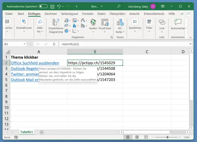 Klicken Sie auf Speichern und gehen Sie zu Datei/Schliessen und zurück zu Excel. Jetzt ist es kinderleicht. Angenommen, Sie haben in Spalte A die verlinkten Begriffe und wollen die hinterlegten Hyperlinks in Spalte B haben. Pflanzen Sie den Cursor z.B. in B2 und geben Sie als Formel =GetURL(A2) ein. Fertig! Diese Formel können Sie nun in die weiteren Zellen kopieren. Falls Sie die URLs nach Auslesen lieber als fixe Werte statt als Resultat einer Formel hätten, gehts wie immer: Kopieren Sie die Spalte mit den URLs und fügen Sie diese z.B. in Spalte C ein, mit dem Befehl Inhalte einfügen/Werte.