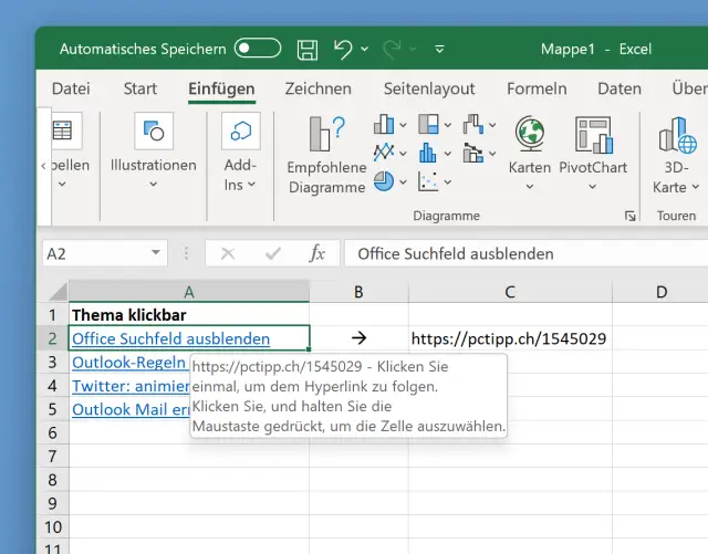 Doch was, wenn Sie später herausfinden, dass Sie die Webadressen nun doch gerne wieder in einer separaten Spalte wollen? Excel bietet zwar eine Funktion, um einen Begriff mit einem Link aus einer anderen Zelle zu versehen. Aber standardmässig gibt es keine, um das Umgekehrte zu erreichen.
