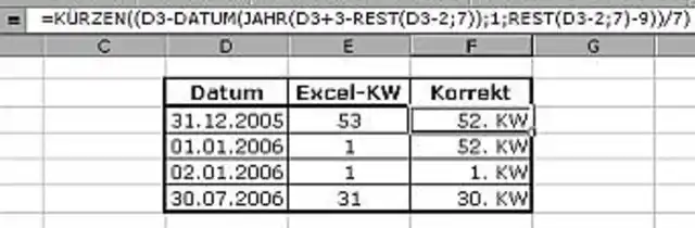 =KÜRZEN((A2-DATUM(JAHR(A2+3-REST(A2-2;7));1;REST(A2-2;7)-9))/7)