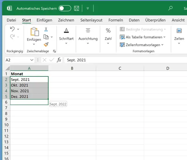In Spalte A haben Sie untereinander die Einträge Sept. 2021, Okt. 2021, Nov. 2021 und Dez. 2021. Sie möchten diese nach unten weiter ausfüllen und erwarten eigentlich, dass dort Jan. 2022 und Feb. 2022 erscheinen. Stattdessen fährt Excel mit Sept. 2022, Okt. 2022 fort.