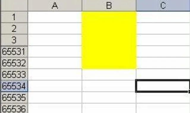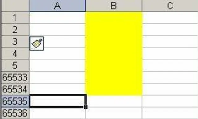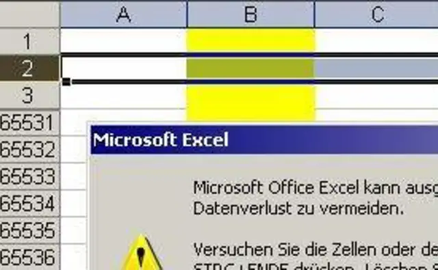 In folgender Tabelle wurde der gesamten Spalte B die Hintergrundfarbe gelb zugewiesen. Wenn Sie nun oberhalb Zeile 2 eine leere Zeile einfügen möchten, erscheint die beschriebene Fehlermeldung.