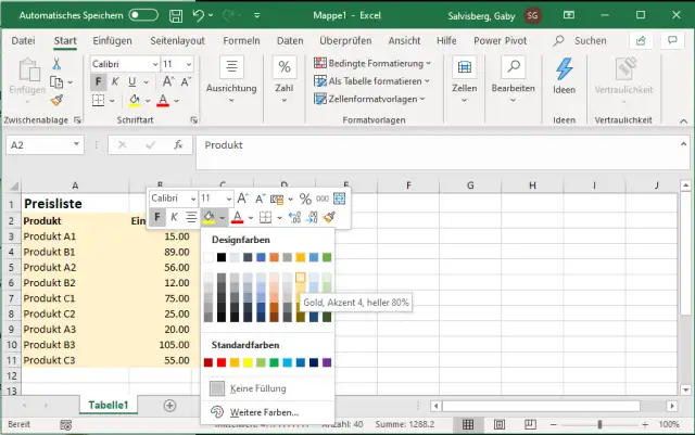 Markieren Sie den betreffenden Tabellenbereich von oben links her. Nach einem Rechtsklick wählen Sie via Füllfarbe die erste Farbe für das Zebramuster aus und weisen damit diese Farbe der gesamten Tabelle zu. Falls die erste gewünschte Farbe weiss ist (z.B. für die Zebrafarben Weiss und Hellgrün), brauchen Sie keine Farbe zuzuweisen. In unserem Beispiel ist die erste Farbe Goldgelb.