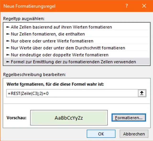 Quelle: PCtipp.chLassen Sie die Zellen gleich markiert und gehen Sie im Reiter Start zu Bedingte Formatierung/Neue Regel/Formel zur Ermittlung der zu formatierenden Zellen verwenden. Im Feld für die Formel tippen Sie =REST(Zeile(C3);2)=0 ein. Über die Schaltfläche Formatieren gehts zu Ausfüllen; hier wählen Sie die zweite gewünschte Farbe fürs Zebramuster.