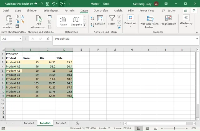 Quelle: PCtipp.chJetzt ist die Tabelle eingefärbt und «als Tabelle» formatiert. Erkennbar im nachfolgenden Screenshot am Zebramuster, an den Filter- und Sortierpfeilen in den Spaltentiteln und im unscheinbaren Winkel-Icon in Zelle D11, welches das Ende der formatierten Tabelle kennzeichnet.