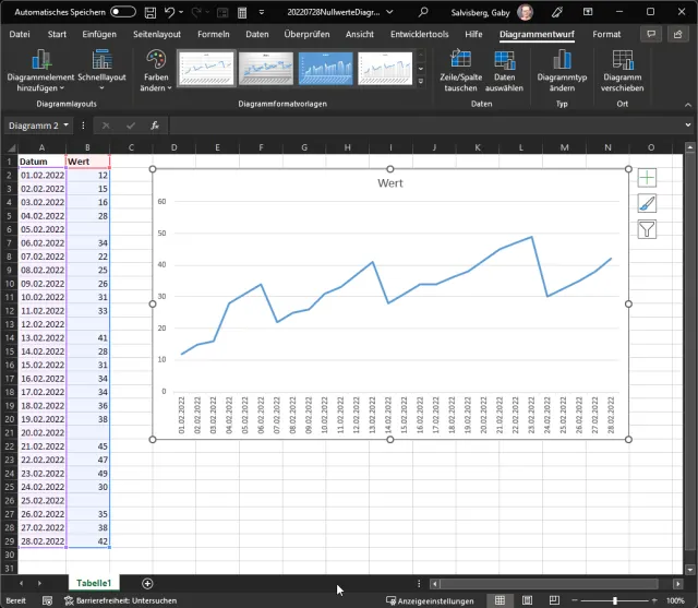 In einer Excel-Tabelle haben Sie alle Kalenderdaten eines Monats mit zugehörigen Werten. Jetzt gab es aber einzelne Tage, an denen Sie keinen Wert eintragen konnten (etwa wie in diesem Beispiel). Die Zellen sind leer. Ein aus diesen Daten erstelltes Liniendiagramm zeigt nun hässliche Lücken.