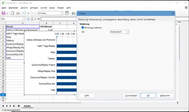 Quelle: PCtipp.chEbenso in LibreOffice: Doppelklicken Sie auf eine der Bezeichnungen der umzudrehenden Achse. Im jetzt geöffneten Fenster aktivieren Sie im Reiter Skalierung die Option Richtung umkehren.
